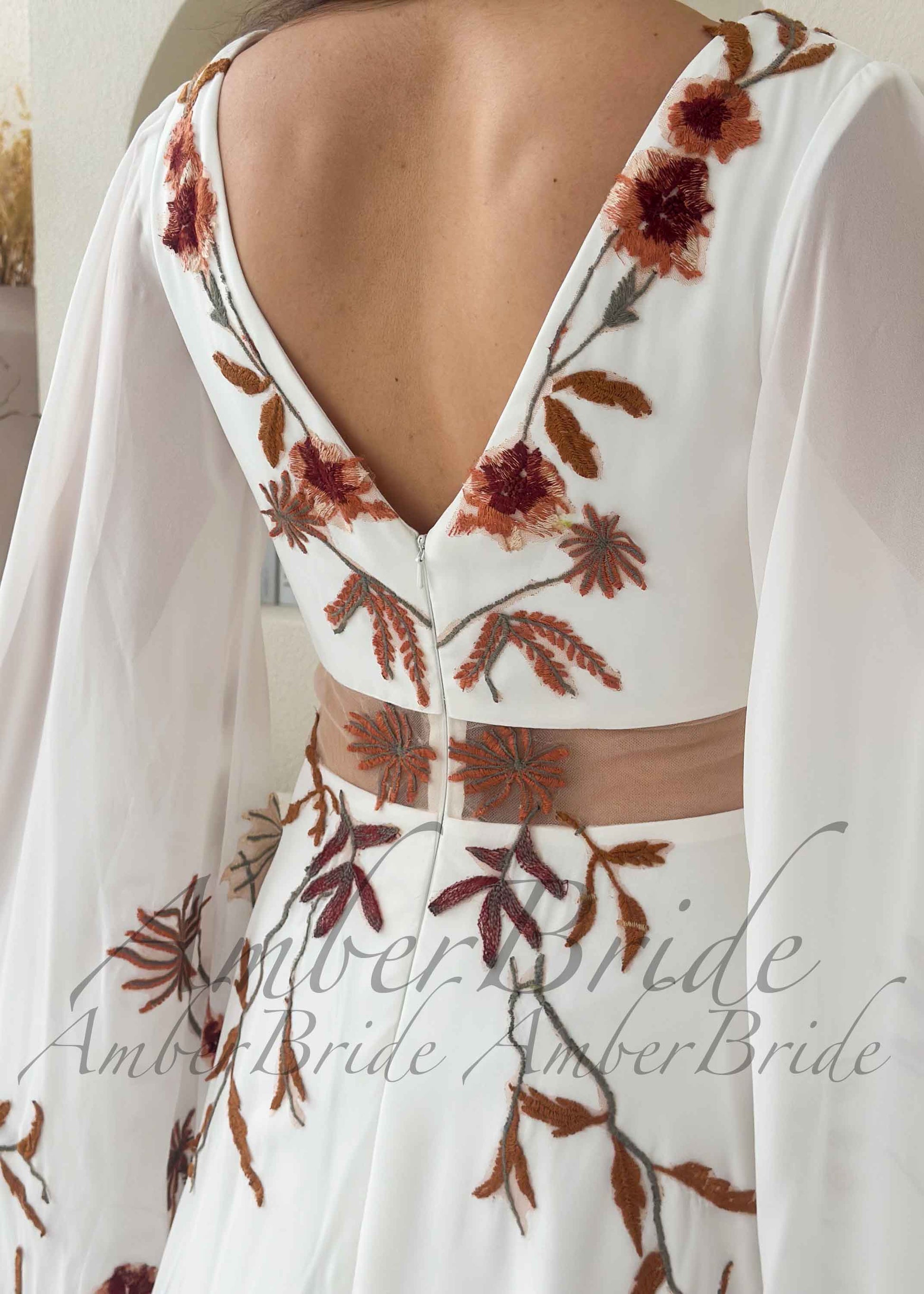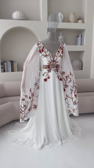 Bohemian Rust Floral Embroidered Wedding Dress with Dramatic Wing Sleeves