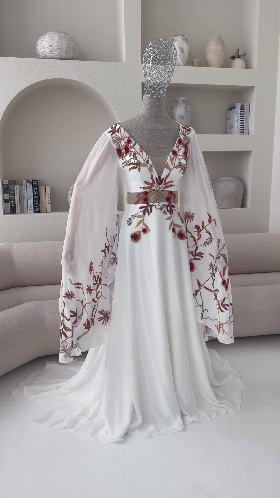 A captivating and artistic A-line wedding gown designed for the modern bohemian bride. This dress features a unique combination of earthy rust-toned embroidery, a daring plunging neckline, and show-stopping wing sleeves, perfect for a one-of-a-kind bridal statement.