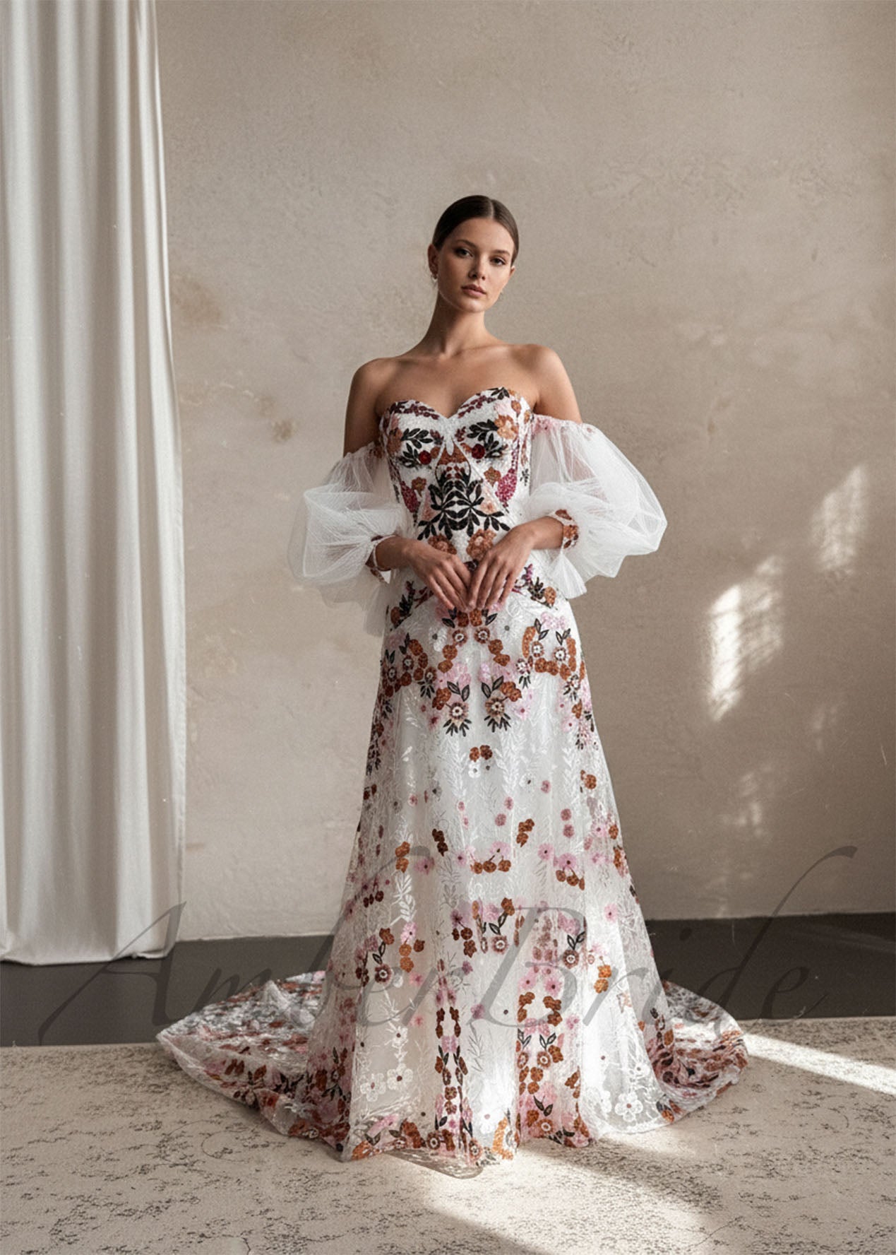 Celebrate your love story in vibrant, bohemian style with this unforgettable wedding gown—a playful yet elegant choice for the free-spirited bride.