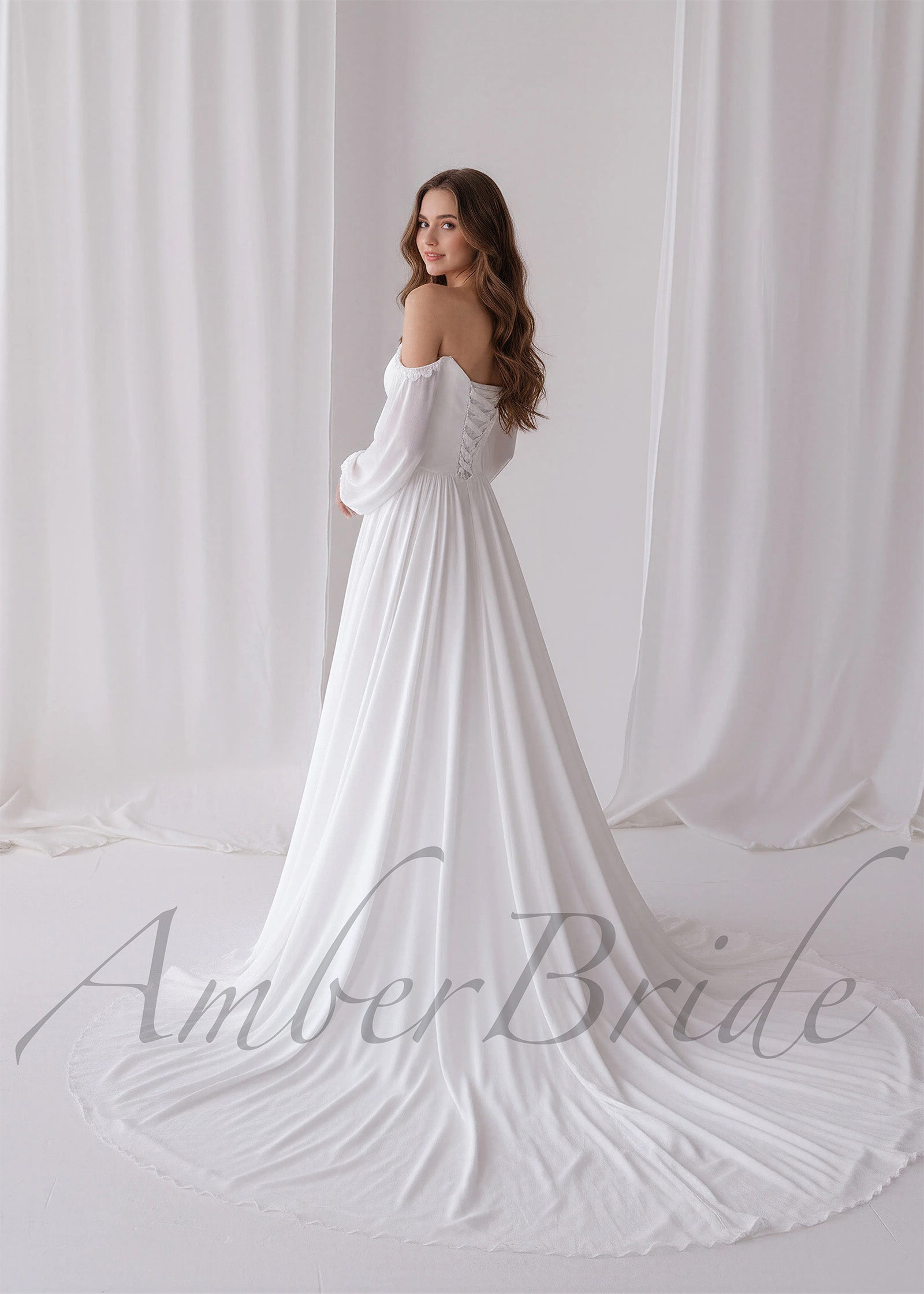 - Off-Shoulder Long Sleeves: The delicate off-shoulder long sleeves provide an ethereal touch, balancing elegance and grace.