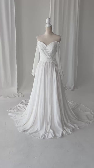 The Elegant Wedding Dress blends a graceful folded organza bodice, flowing chiffon skirt, and timeless off-shoulder sleeves, making it the ideal choice for a bride seeking both elegance and drama.