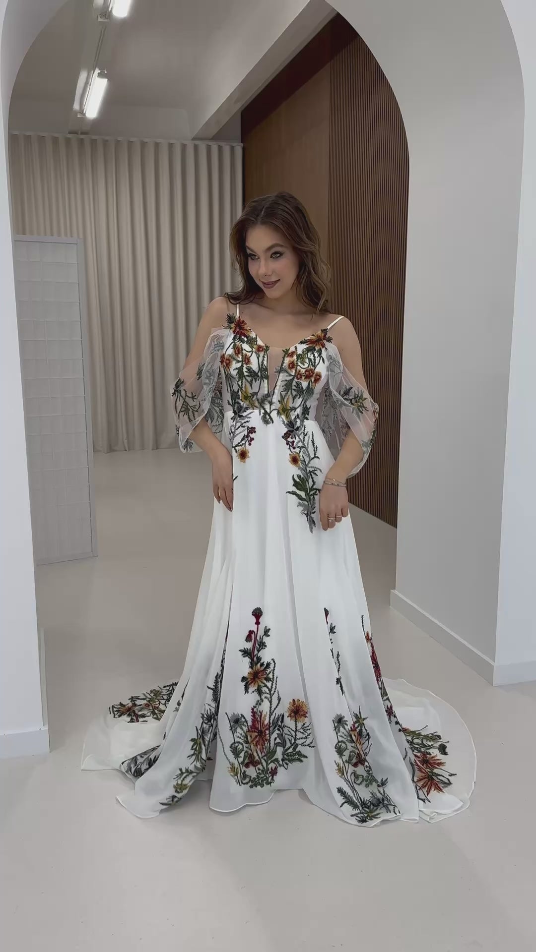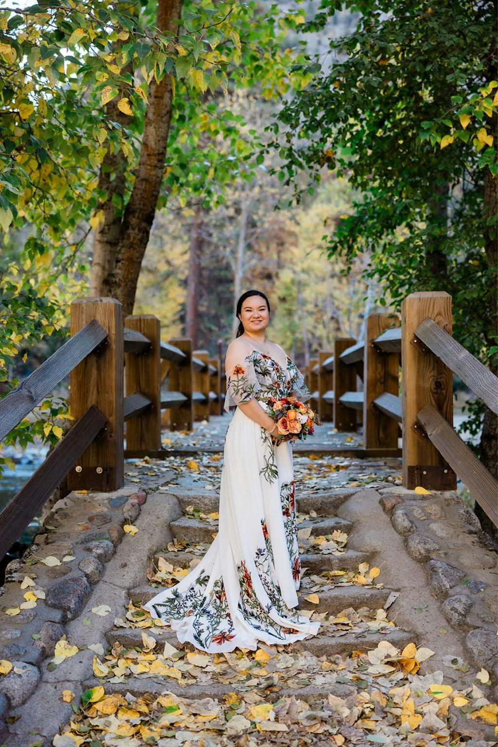 This Rustic Wedding Dress combines colorful floral embroidery, an elegant neckline, and a flowing chiffon skirt, perfect for an outdoor or garden wedding.