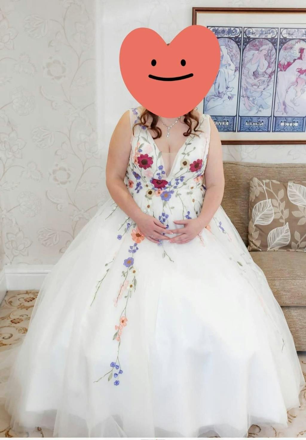 - Floral Style Adorned with Colorful Flowers: This dress is beautifully adorned with colorful floral appliqués, adding a lively and enchanting touch that brings a burst of color to your wedding look.