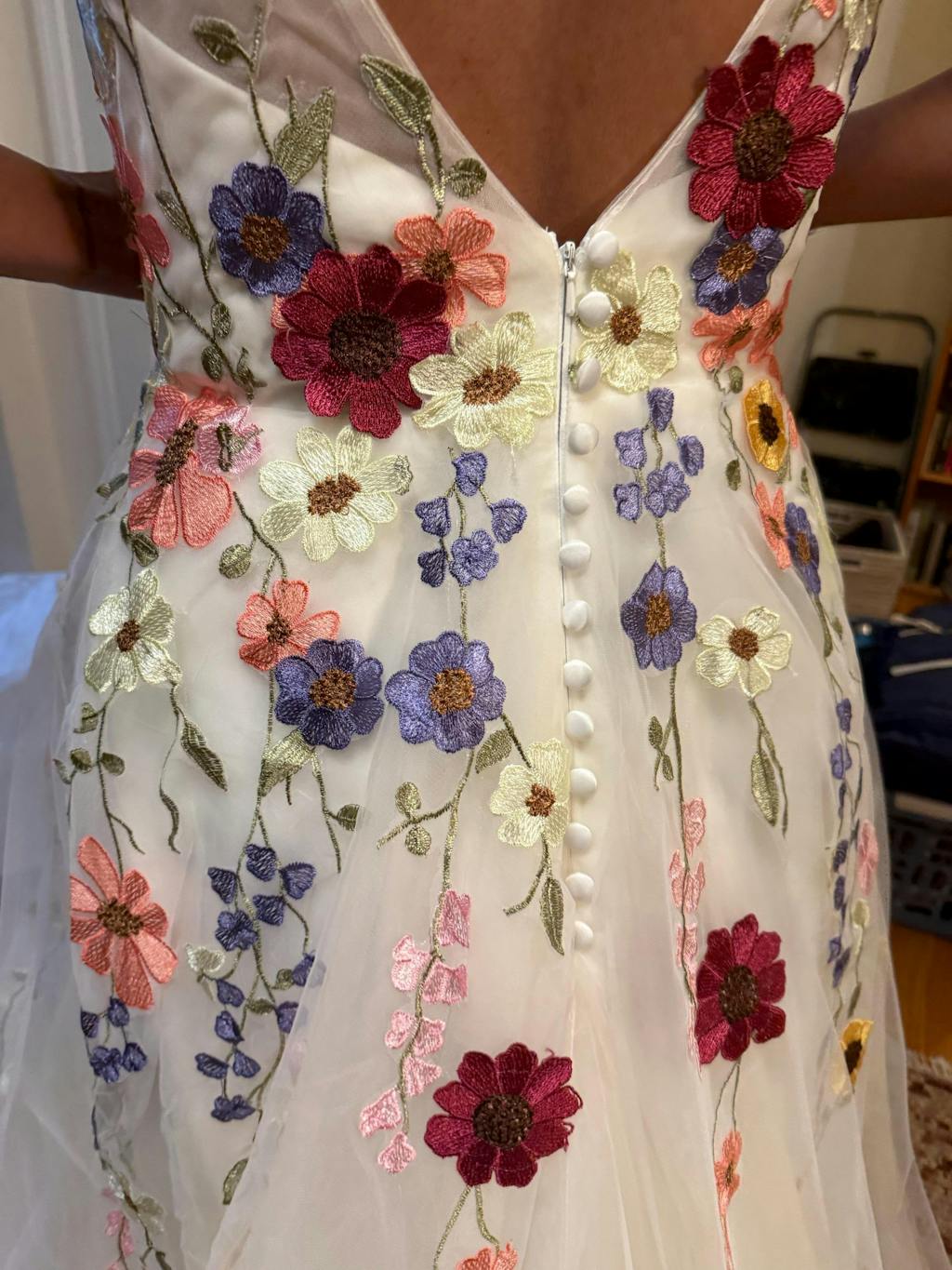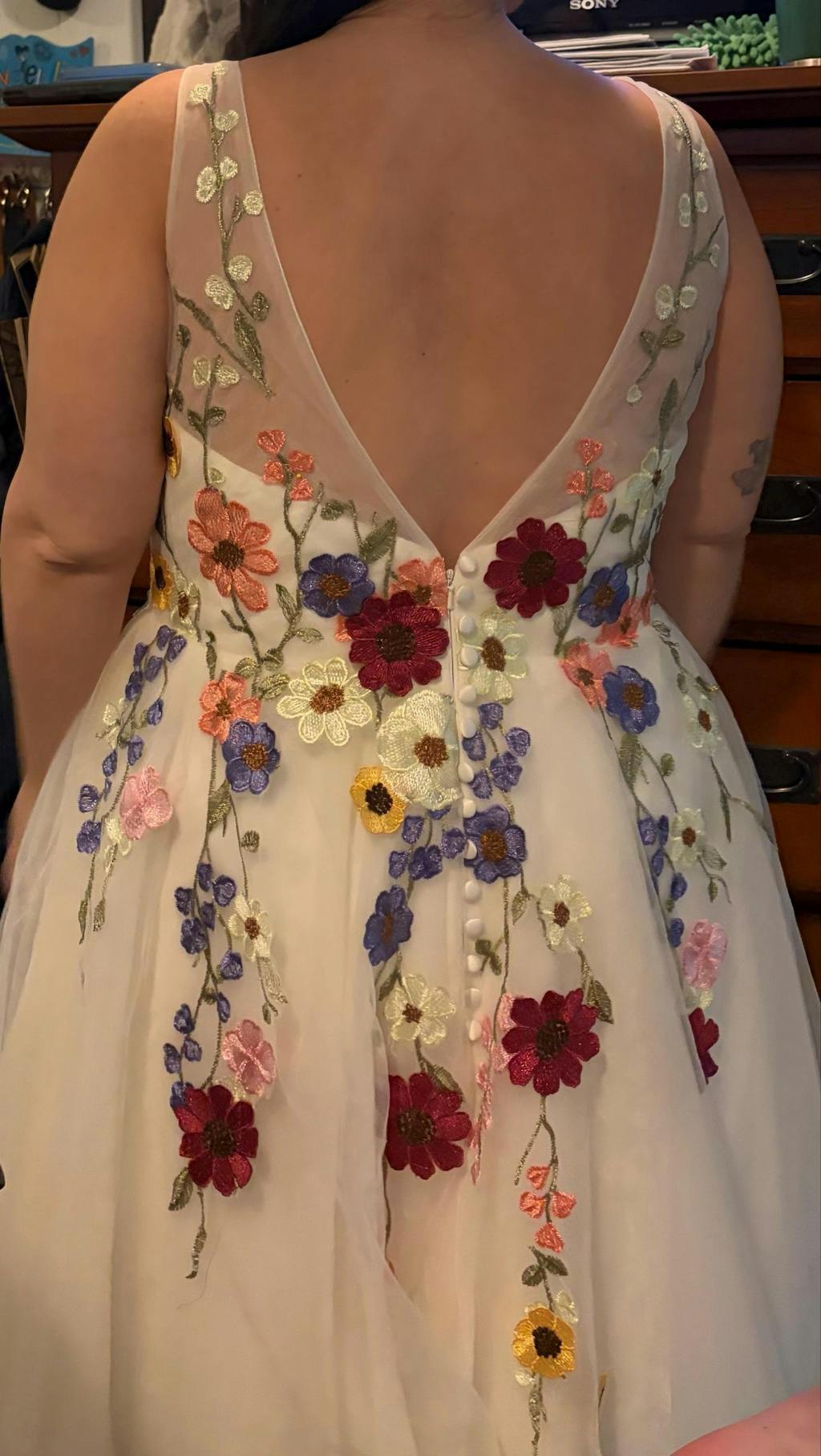 - Backless Design: The backless feature adds a daring and contemporary twist, balancing the floral romance with a hint of allure.