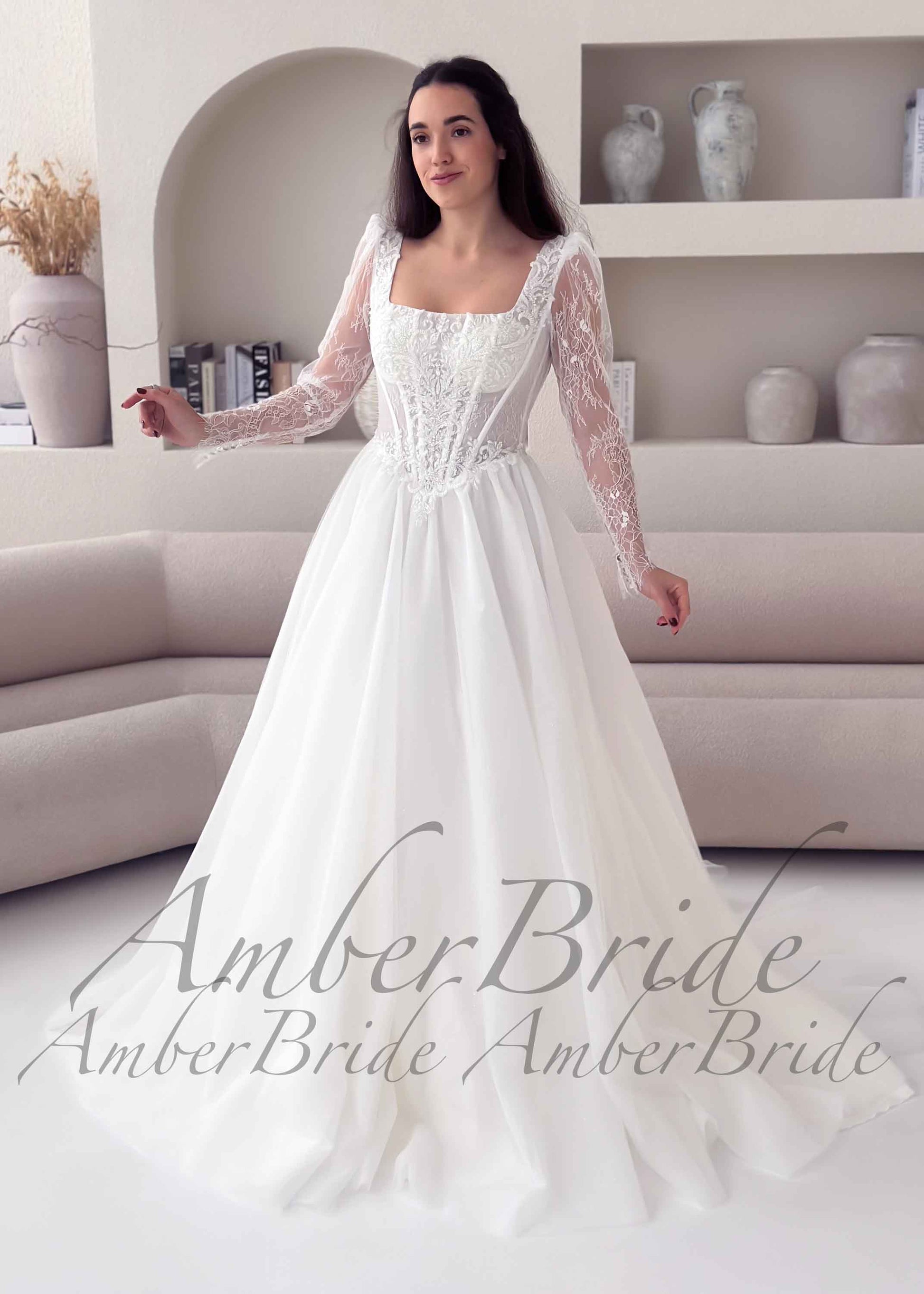 Romantic Basque Waist A-Line Wedding Dress with Long Lace Sleeves