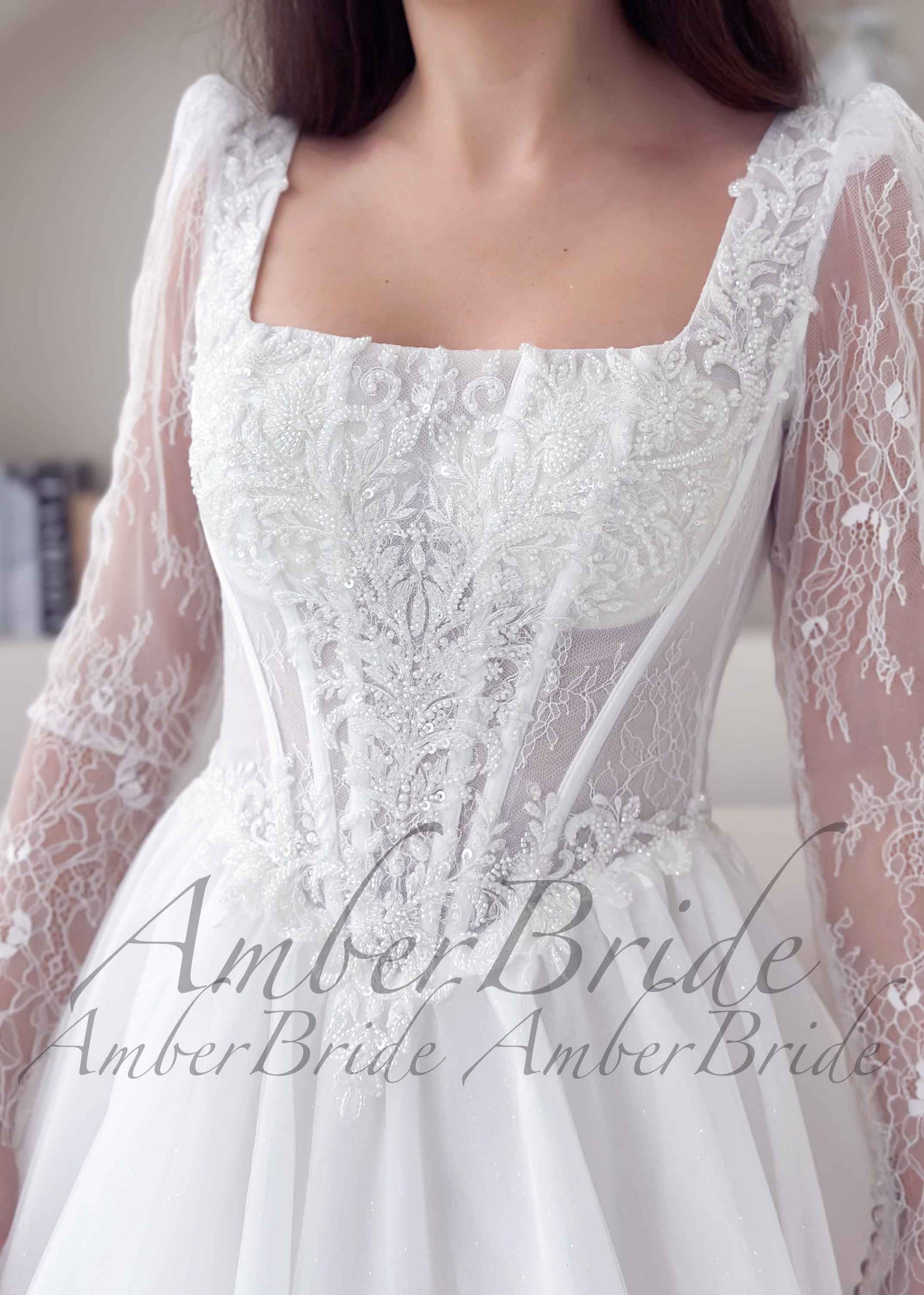 ✔ Details: The bodice is decorated with hand-applied beads and sequins, highlighting visible corset boning for a modern bridal touch.