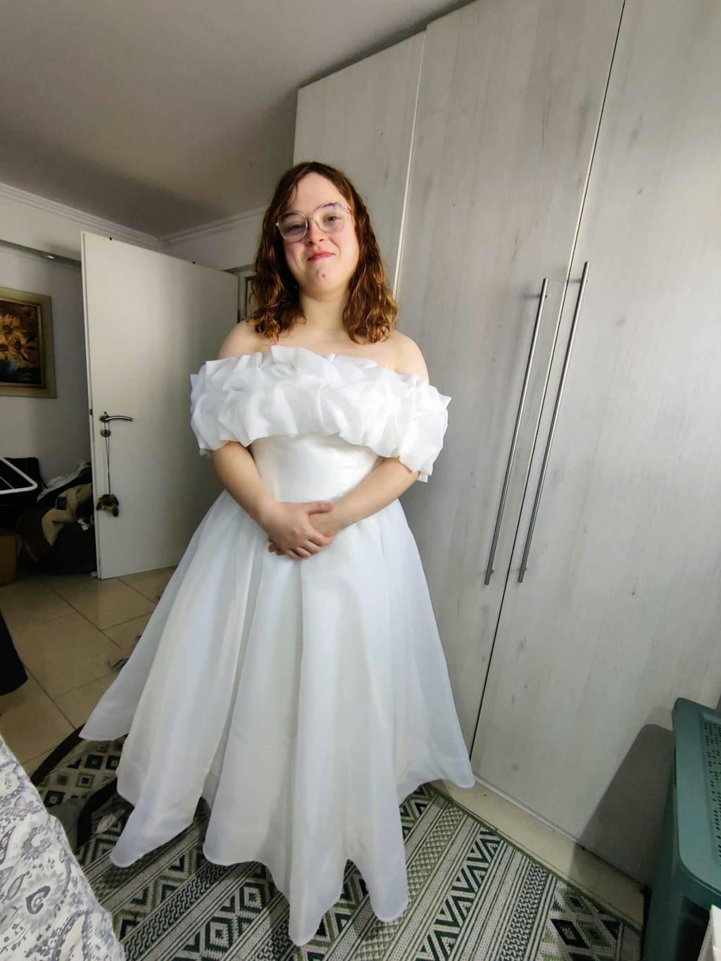 - Off-the-Shoulder Ruffled Neckline: Layers of soft organza ruffles frame the shoulders and collarbone with dramatic, airy charm.