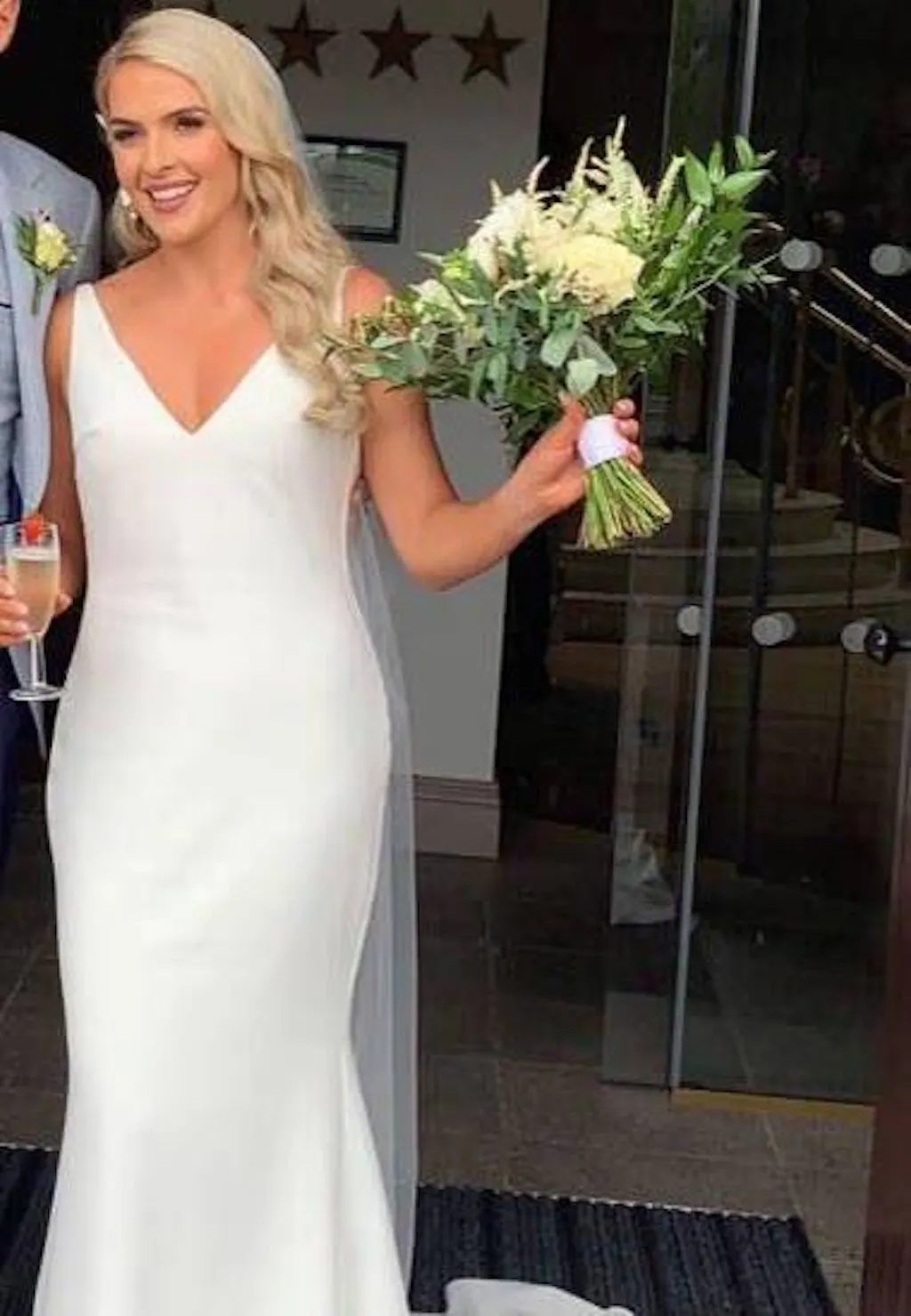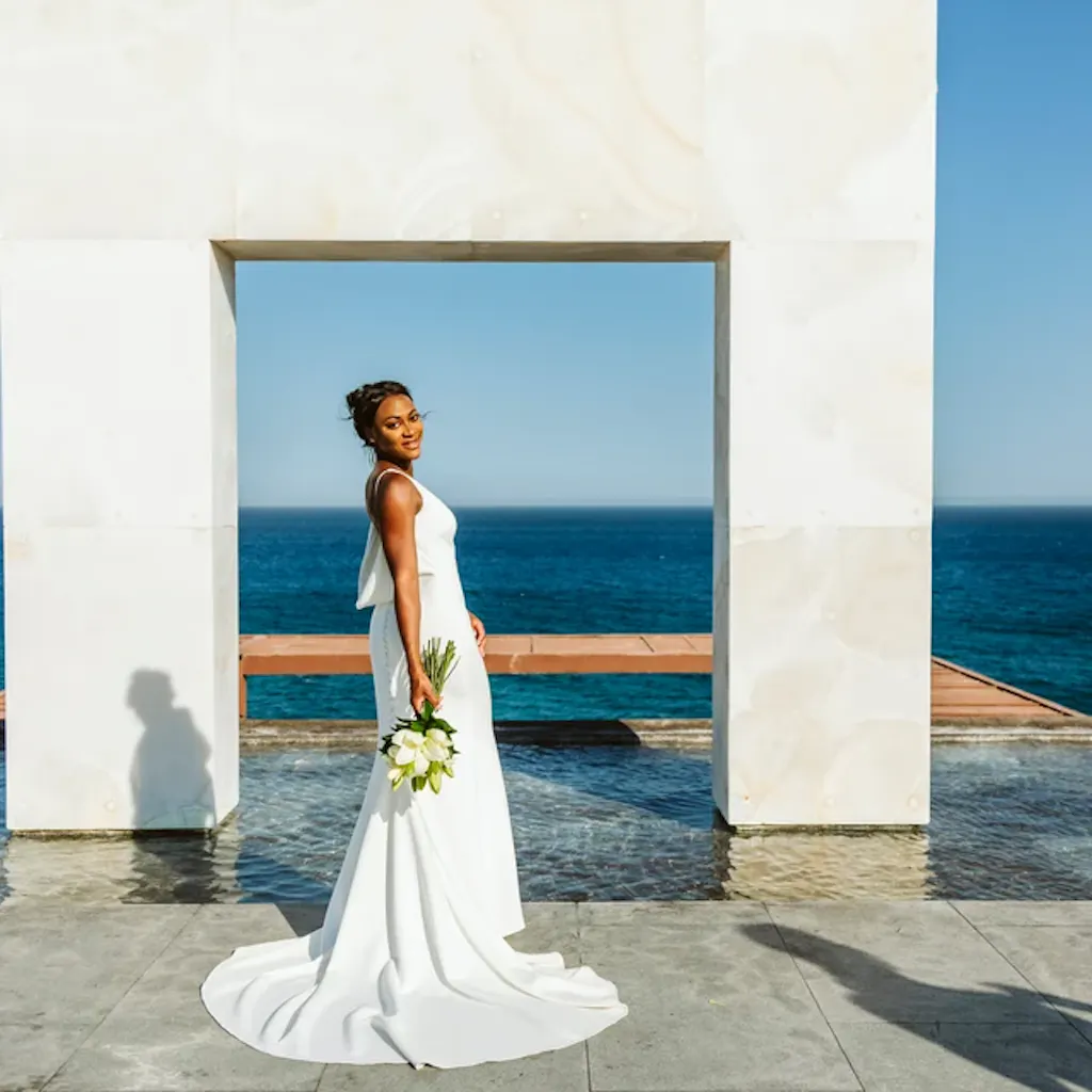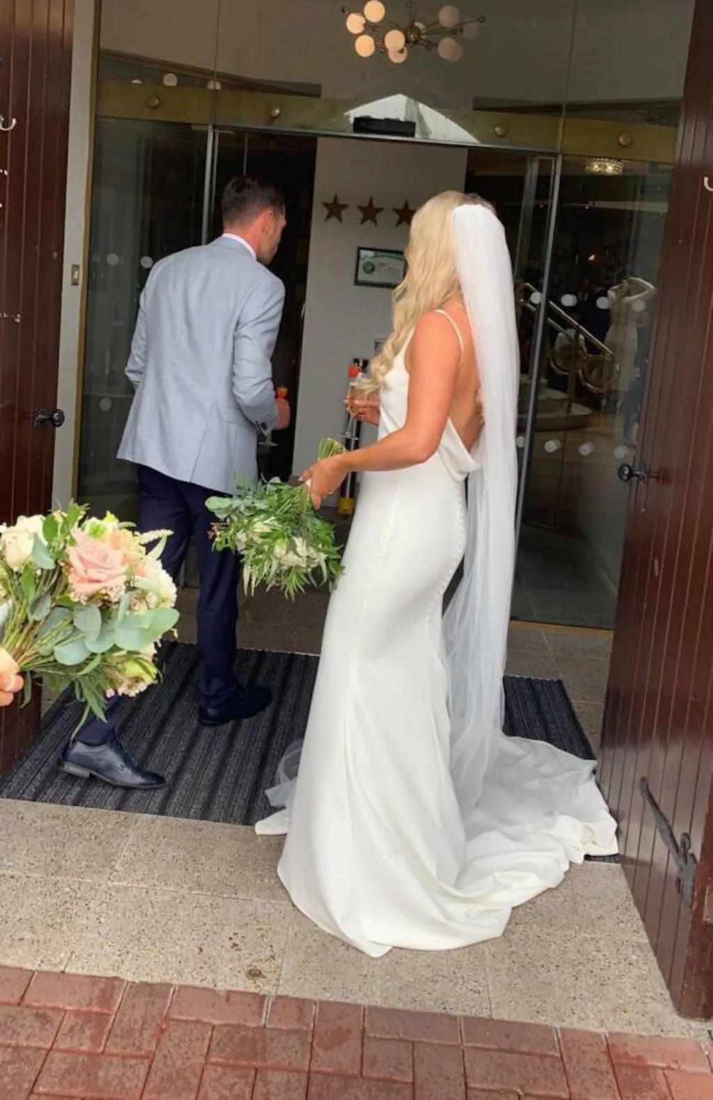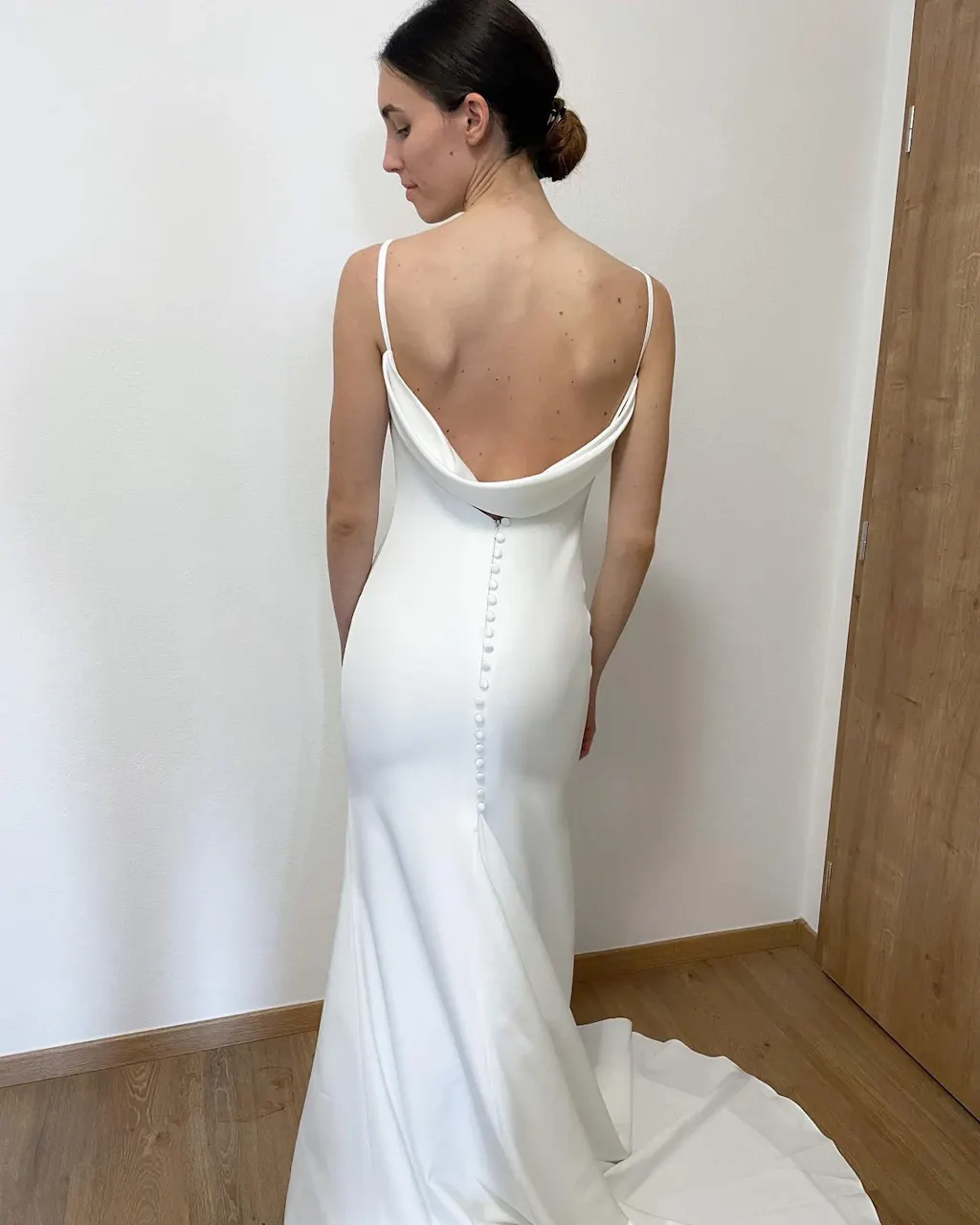 Discover the epitome of modern elegance with our minimalistic satin mermaid gown. The V-neck paired with delicate spaghetti straps highlights a graceful neckline, descending into a sultry low back adorned with decorative buttons for an added touch of sophistication. Crafted for the contemporary bride, this wedding dress effortlessly marries sleek design with timeless appeal.
